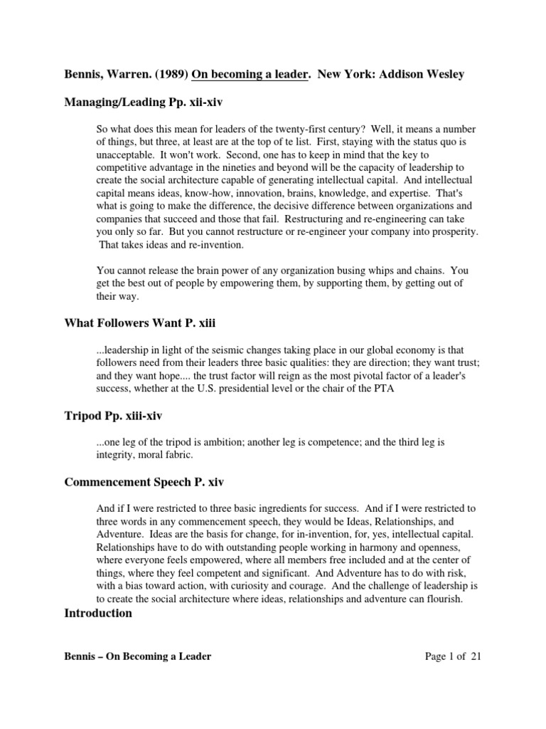 Warren bennis maps the terrain of leadership with a rare sense of wisdom and authority. ―daniel goleman only warren bennis could write a book on leadership that is so inspiring and insightful, captivating and wise, eloquent and revealing. This book, long established as a management classic, is about the 'hows' of leadership: (1989) on becoming a leader. On becoming a leader is the hows: The leader is an original.